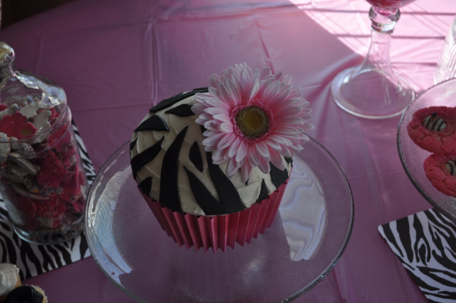 I had such a fun time planning this party. I decided to go with a zebra theme because she has a way cute skirt that was given to us from my friend Roslyn. Anyway I decded not to do a full dinner becusae I wanted to use Apotacary jars and do a bunch of desserts. So we just did fruit, veggies, chips and salsa. We also had pink (of course) lemonade and for the desserts a beautifl cake, strawberry cookies with a hug on top so the look zebraish, white popcorn, black licorice, pink and white frosted circu cookies,I also had a bakery make hot pink donuts. I thought everything looked so cute!!
